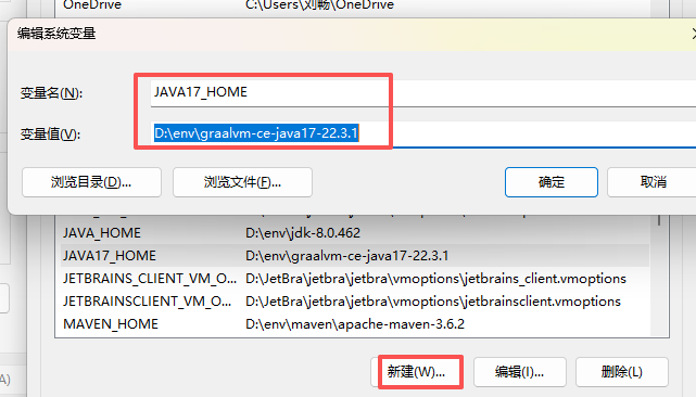 新建一个环境变量,选中你解压后文件jdk17目录