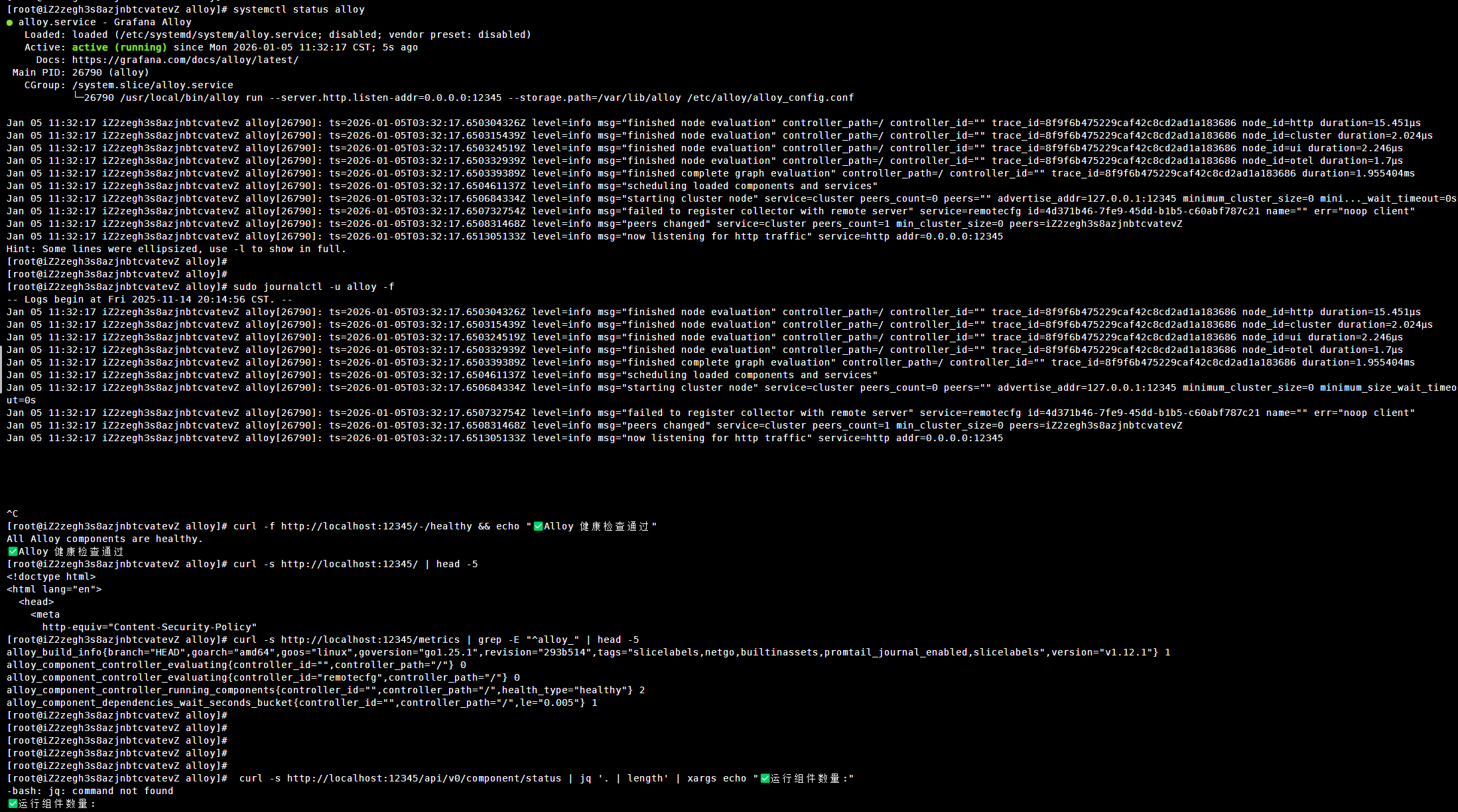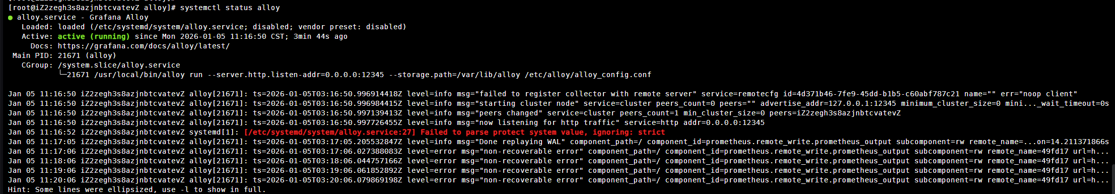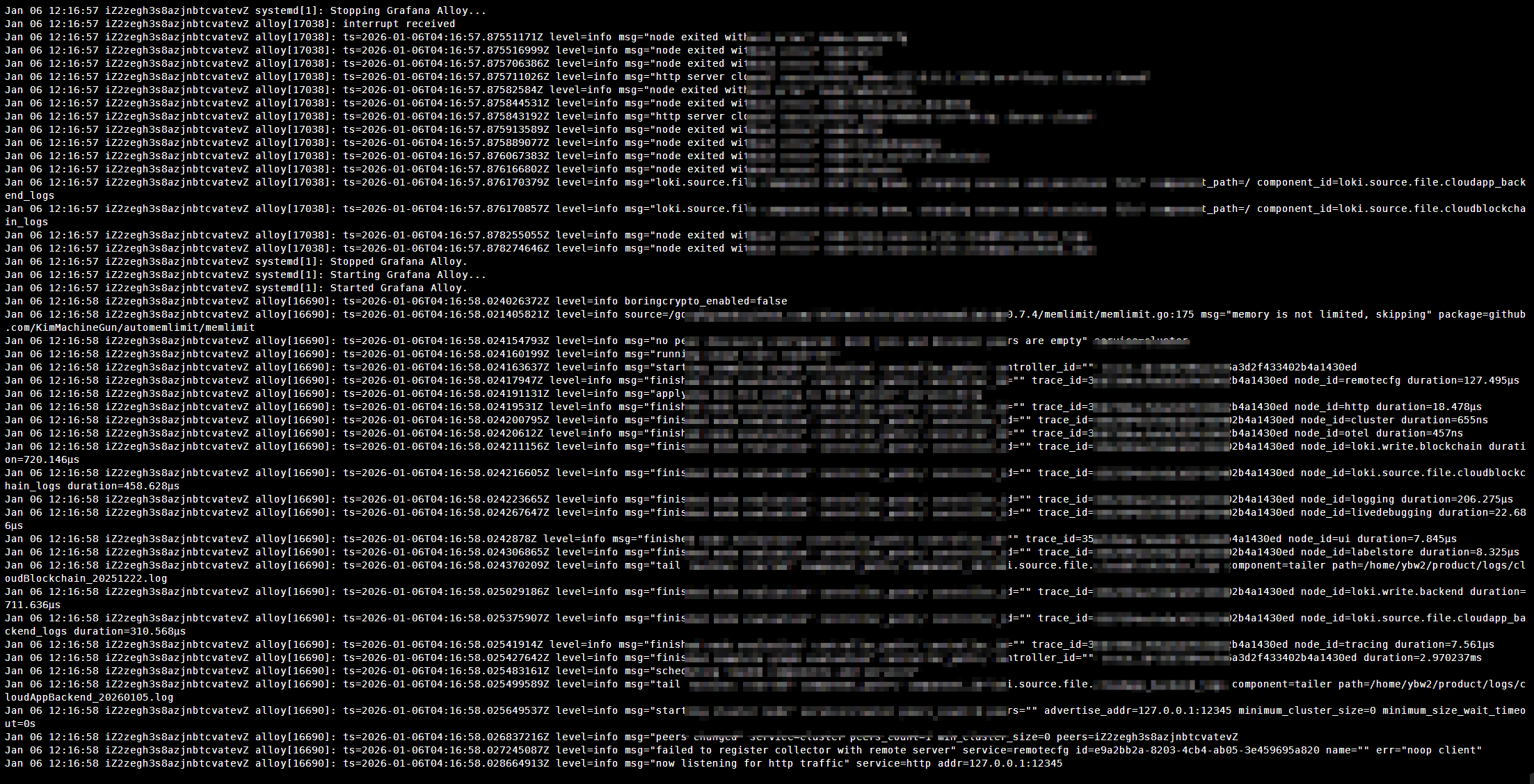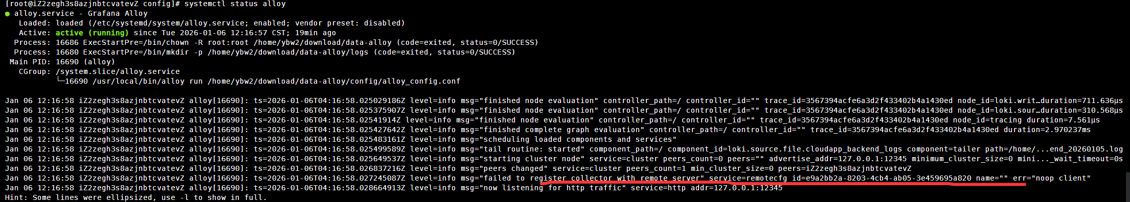 我是单机,红线为集群问题没有深入研究,查看启动日志如下 journalctl -u alloy -f