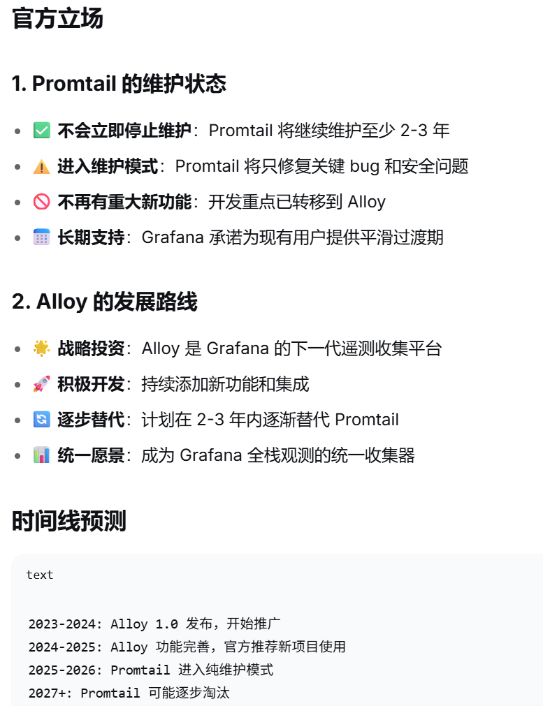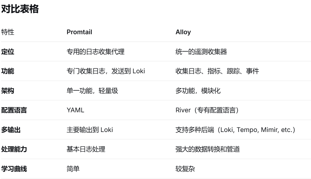 基于grafana和loki的轻量级日志平台目前有2种选择Promtail和alloy,查阅各方资料都说Promtail将在后续版本迭代中放弃,deep seek对两者对比如下