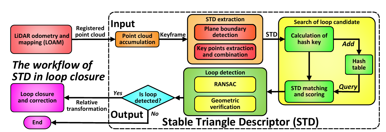 本文提出了一种新的三维位置识别全局描述子------稳定三角形描述子(Stable Triangle Descriptor,STD)。对于任意一个三角形,其形状可由边长或内角唯一确定,并且三角形的形状在刚体变换下保持完全不变。基于这一特性,本文首先设计了一种高效的三维点云局部关键点提取方法,并将这些关键点编码为三角形描述子。随后,通过匹配不同点云中三角形描述子的边长(及其他辅助信息)实现位置识别。由描述子匹配得到的点对应关系还可进一步用于几何一致性验证,从而显著提升位置识别的准确性。