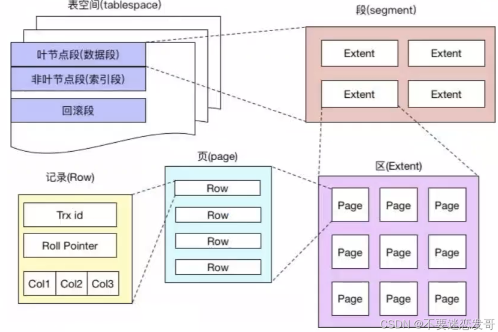 段是最大的逻辑单位 ,一个表空间由多个段组成。不同的段存放不同类型的数据。