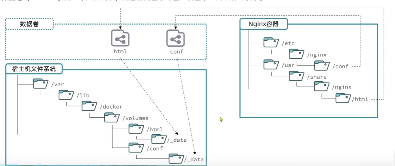 数据卷(volume):是一个虚拟目录,是容器内目录与宿主机目录之间映射的桥梁