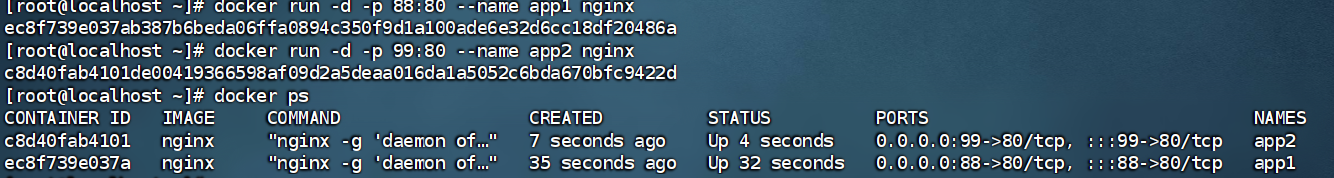 - 首先存储创建两个容器app1,app2,外部主机端口分别为88,99
