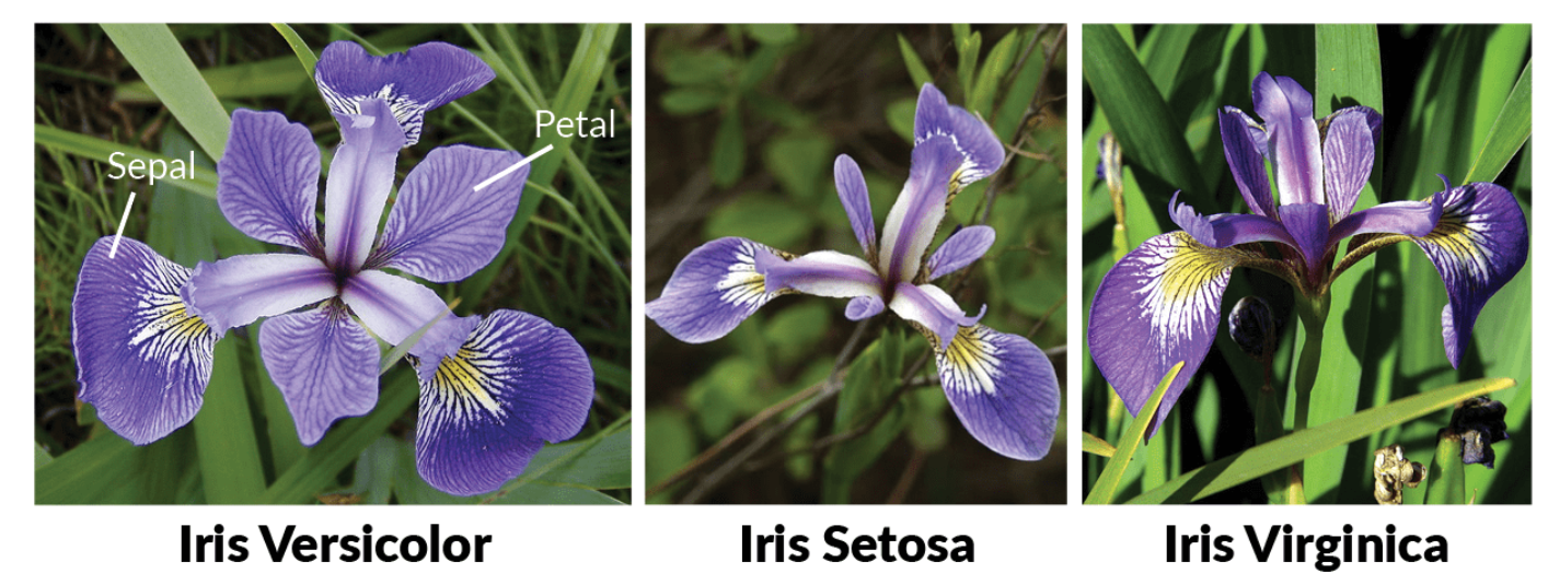 该数据集包含3个类别,每类50个实例,每个类别对应一种鸢尾花植物。其中一个类别与其他两个是线性可分的;而后者两个类别之间彼此不是线性可分的。