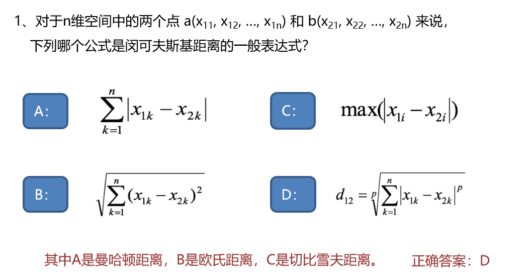 欧式距离就是日常生活中的距离,曼哈顿距离是方方正正的街道都到终点的距离,切比雪夫是国际象棋里国王可以横、竖、正45度斜角的距离,闵可夫斯距离是一类距离的统称。