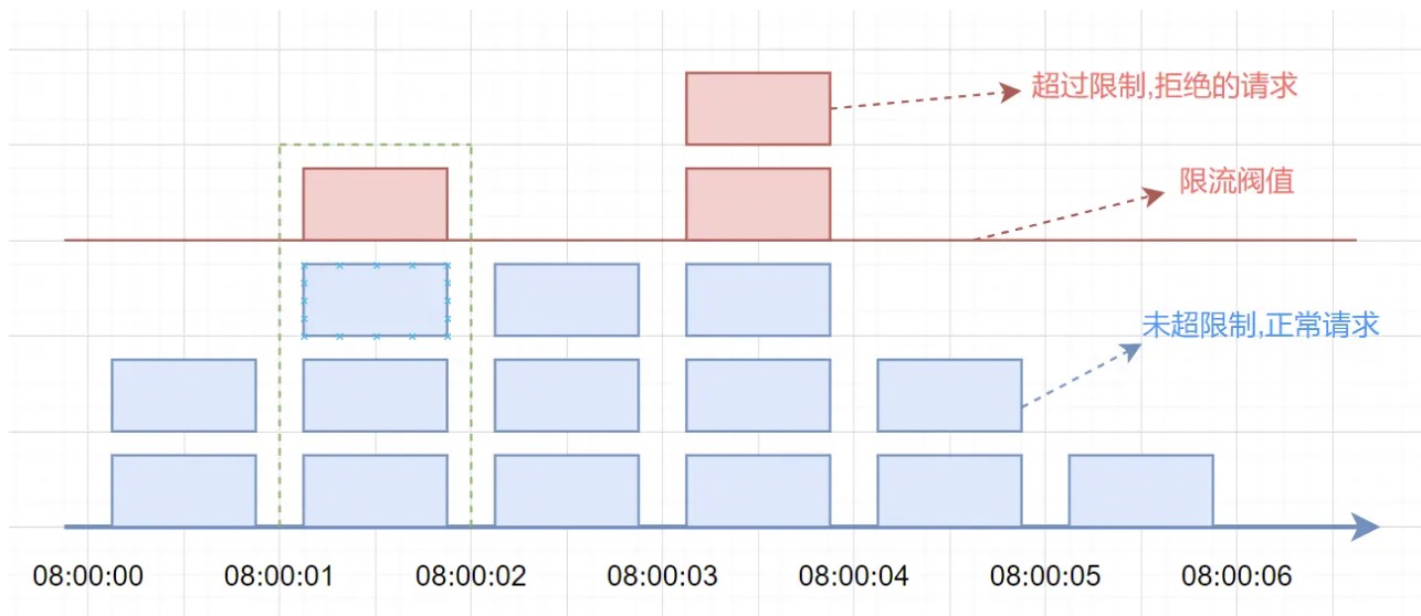 将 1 分钟分成 6 个 10 秒大小的子窗口的例子,假设请求的速率现在是 20 次/秒,从 0:05 时刻开始进入,那么在 0:05~0:10 时间段内会放进 100 个请求,同时接下来的请求都会被限流,直到 1:00 时刻窗口滑动,在 1:00~1:05 时刻继续放进 100 个请求。如果把 0:05~1:05 看作是 1 分钟的时间窗口,那么这个窗口内实际的请求量是 200,超出了给定的阈值 100。