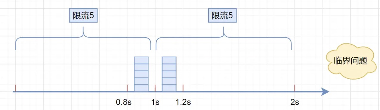 但是,这种算法有一个很明显的临界问题:假设限流阀值为5个请求,单位时间窗口是1s,如果我们在单位时间内的前0.8-1s和1-1.2s,分别并发5个请求。虽然都没有超过阀值,但是如果算0.8-1.2s,则并发数高达10,已经超过单位时间1s不超过5阀值的定义啦。
