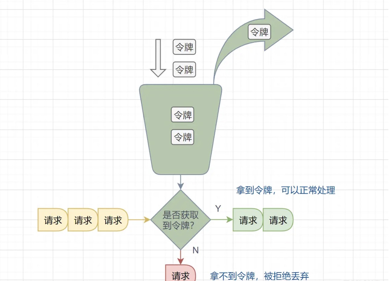 ●系统在接受到一个用户请求时,都会先去令牌桶要一个令牌。如果拿到令牌,那么就处理这个请求的业务逻辑;
