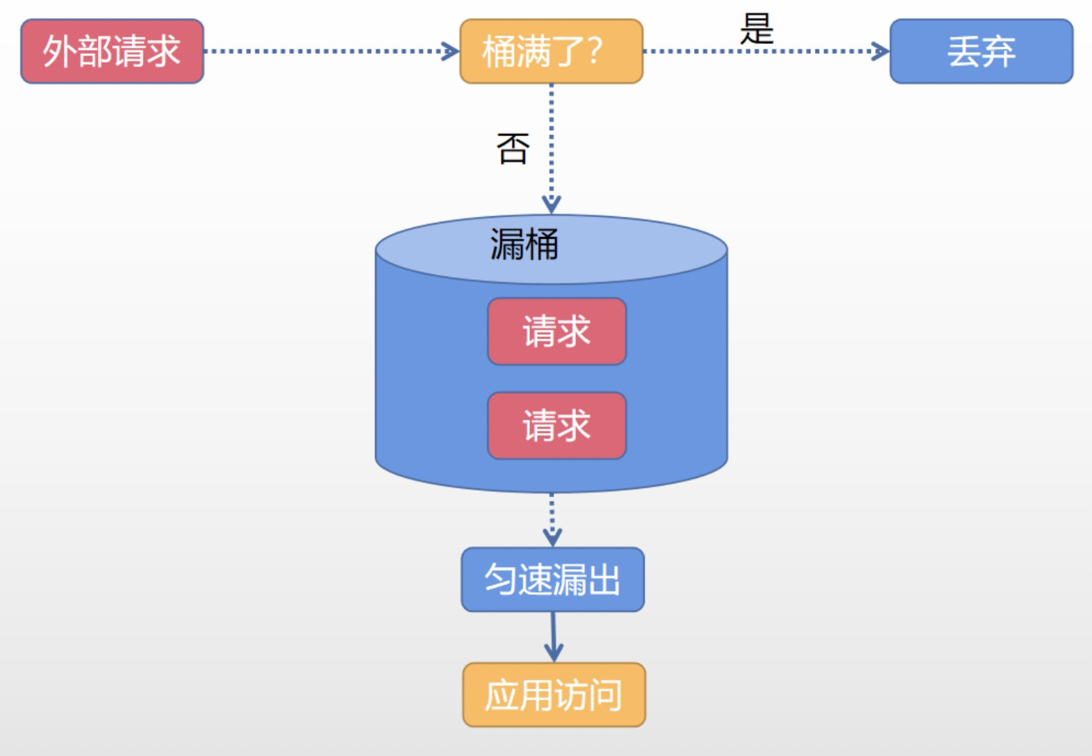它的原理很简单,可以认为就是注水漏水的过程。往漏桶中以任意速率流入水,以固定的速率流出水。当水超过桶的容量时,会被溢出,也就是被丢弃。因为桶容量是不变的,保证了整体的速率。