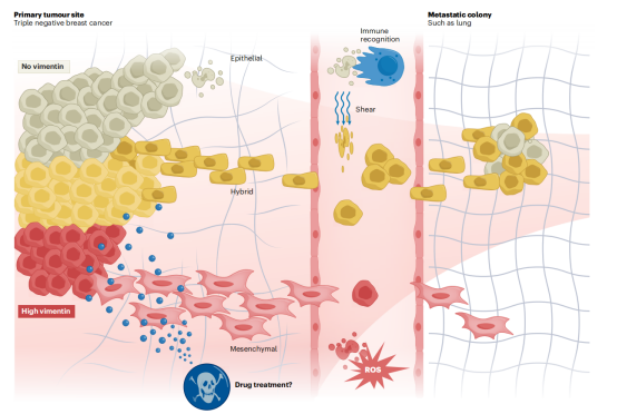 波形蛋白的表达和上皮-间质转化能增强原发肿瘤细胞的运动性和变形能力,从而促进其从原发灶的局部侵袭和扩散。完全的上皮-间质转化状态会导致细胞间连接丧失,使得肿瘤细胞以高度间质化的单个细胞形式进入循环,这种状态在远端组织定植时效率低下。完全间质化的循环肿瘤细胞在血液中更脆弱,且难以在转移部位重新启动增殖和形成集落。保留部分上皮特性的"混合型EMT"状态或细胞簇,因其兼具侵袭性和一定的细胞协作能力,反而被认为更有利于转移。