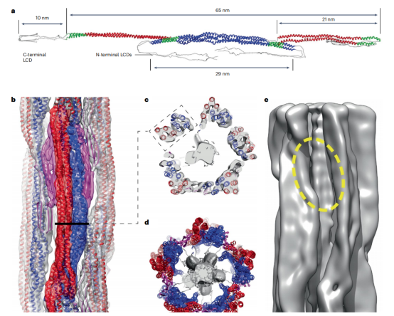 波形蛋白由466个氨基酸组成,其特征是卷曲螺旋二聚体结构。其结构的核心是α螺旋棒状结构域,两侧是头部和尾部结构域。棒状结构域富含酸性和碱性氨基酸,通过连接肽L12分为螺旋1和螺旋2。每个螺旋都具有独特的特征和模式,这些特征和模式有助于蛋白质的稳定性和结构。在生理环境下,波形蛋白能够自发组装成直径为10 nm的丝状结构。其组装过程遵循从平行卷曲螺旋二聚体到四聚体,再到单位长度丝状结构的渐进过程。这些丝状结构是由蛋白质氨基酸序列之间复杂的相互作用形成的。这种相互作用由疏水键和离子键辅助。细胞内、细胞表面及细胞外环境中均可检测到波形蛋白的截短形式。