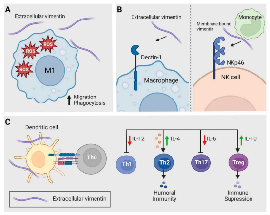 细胞外VIM的存在诱导ROS的产生,这是M1型巨噬细胞的特征。同时,细胞VIM增强其吞噬和迁移能力。膜结合或细胞外的Vimentin可作为潜在危险相关分子模式(DAMP)发挥作用,与巨噬细胞或癌细胞上的Dectin-1和NK细胞上的NKp46结合。细胞外波形蛋白减少了IL-12和IL-6的产生,因此抑制了T细胞向Th1或Th17表型的分化。相反,刺激IL-10的产生,增强调节性T细胞(Tregs)的分化。