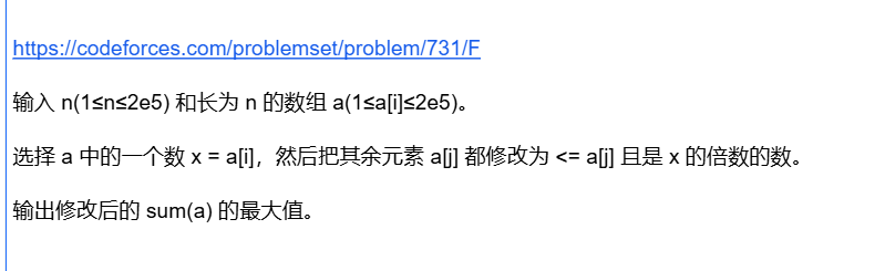 k x , ( k + 1 ) x ) \[kx,(k+1)x) \[kx,(k+1)x)之间的数都会变成 k x kx kx,我们枚举 x x x,枚举 x x x的所有倍数,然后前缀和统计每一个 \[ k x , ( k + 1 ) x ) \[kx,(k+1)x) \[kx,(k+1)x)里有多少个数字,就能计算出一个 x x x的 s u m ( a ) sum(a) sum(a)。整体是一个调和级数枚举 ## [E. Stairs and Lines](https://codeforces.com/problemset/problem/498/E) 分段矩阵快速幂 状压 dp预处理系数   转移是一个 d p dp dp,因为每一列的右边界的选择,之和这一列的左边界有关,是无后效的,故用一个 m a s k mask mask表示第 i i i列的右边界,我们可以枚举这一列的左边界进行转移,确定了左边界还是可以有多种转移,还要考虑这一列的中间的横边的情况,最暴力的就是继续枚举,但把这个问题抽象出来,我们确定了左右两个 m a s k mask mask,中间每个横边可选可不选,问多少种方案使得没有一个格子有四条边,显然可以 d p dp dp解决。 每一段的高度相同,转移都是相同的,考虑快速幂加速转移,转移矩阵的每个位置,对应两个 m a s k mask mask,分别表示这一列的左右边界的情况,接下来跑一个 d p dp dp即可求出这个情况的方案数,也就是转移系数。 但是有多段,两段交界处,列高变了,需要重新构造状态向量和转移矩阵,利用前一段的结果即可构造。 初态和末态都是 m a s k mask mask全一 ## [E. Okabe and El Psy Kongroo](https://codeforces.com/problemset/problem/821/E) 分段快速幂  仍然分段进行快速幂,同时转移就是朴素的网格图路径问题,比较简单 ## [C. Vasya and Basketball](https://codeforces.com/problemset/problem/493/C) 枚举  把两队的所有距离一块排序,显然两个元素中间的区间,取任何值结果都是一样的,所以需要枚举的距离只有 O ( n + m ) O(n+m) O(n+m) ## [E. Power of Points](https://codeforces.com/problemset/problem/1857/E) 扫描线 前缀和  看成有多条线段共享一个端点,每次把这个端点移动一下,求线段长度和?类似于扫描线前缀和的思想,维护两侧的线段个数,和线段和,移动可以 O ( 1 ) O(1) O(1)更新线段和 ## [D. Right Left Wrong](https://codeforces.com/problemset/problem/2000/D) 贪心  每次选一个区间,消掉,获得区间和。每次选最左侧 L L L和最右侧 R R R是最优的。 如果 \[ L 1 , L 2 , R 1 , R 2 \] \[L_1,L_2,R_1,R_2\] \[L1,L2,R1,R2\]这样配对,两个区间有交集,消除完一个区间后另一个就不能消除了,不如 \[ L 1 , R 2 \] \[L_1,R_2\] \[L1,R2\]优 如果 \[ L 1 , R 1 , 0 , 0 , 0 , L 2 , R 2 \] \[L_1,R_1,0,0,0,L_2,R_2\] \[L1,R1,0,0,0,L2,R2\],两个各自配对,中间这一段 0 0 0的元素值则无法加入,不如 \[ L 1 , R 2 \] \[L_1,R_2\] \[L1,R2\]优 相向双指针分别从开头结尾开始维护下一个 L , R L,R L,R即可