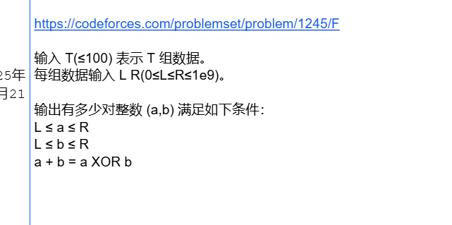 加起来等于异或,意味着两个数的交等于零。数位dp同时维护两个数的二进制位取什么即可,同时为1无法转移,别的都可以转移