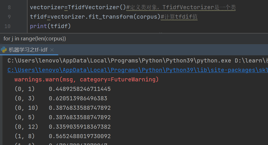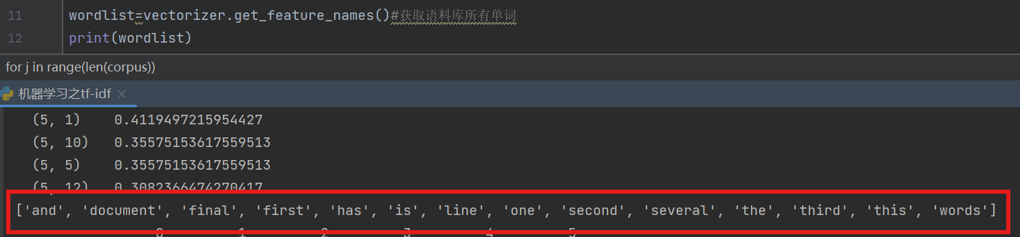 第一个输出,输出的tfidf,括号(0,1)的意思是第0篇文章中的第一个词的tfidf值是0.4489258246711445