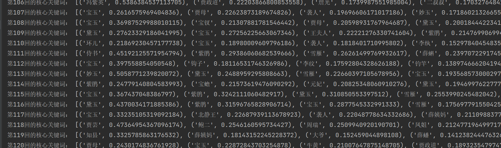 print('第{}回的核心关键词:'.format(i+1),resdict[0:10])#打印前十个