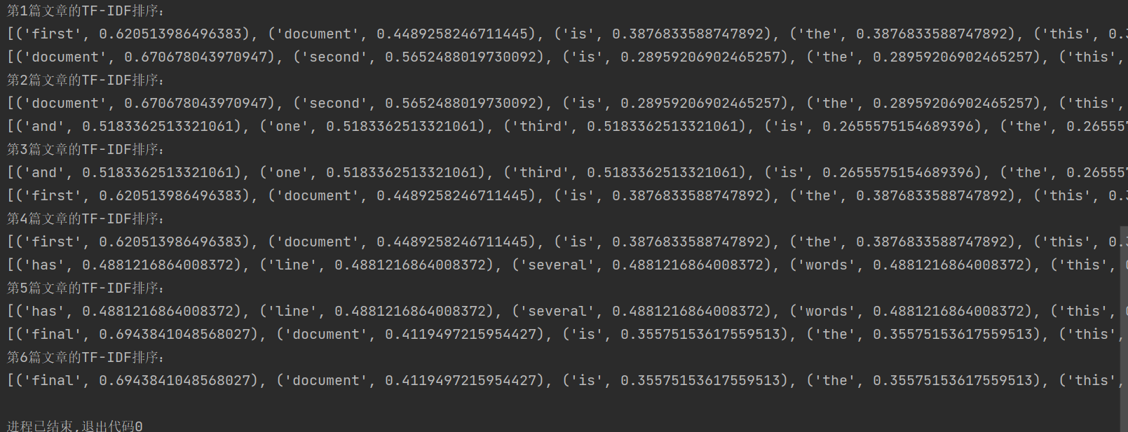 第0篇就是第一篇,但是第一个词并不是该篇文章的第一个词,而是整个语料库的中的第一个值,也就是我们第二个输出,第一个词就是'document',