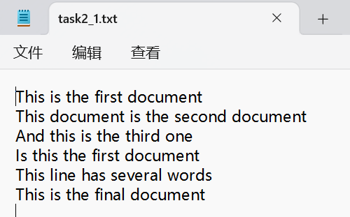 这种形式就和一开始做的小语料库案例一样的形式,一行是一篇文章,这些文章的词库就组成了一个语料库