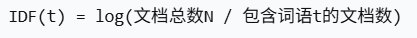 idf:逆文档频率,单词在所有文档中的稀缺程度,全局重要性