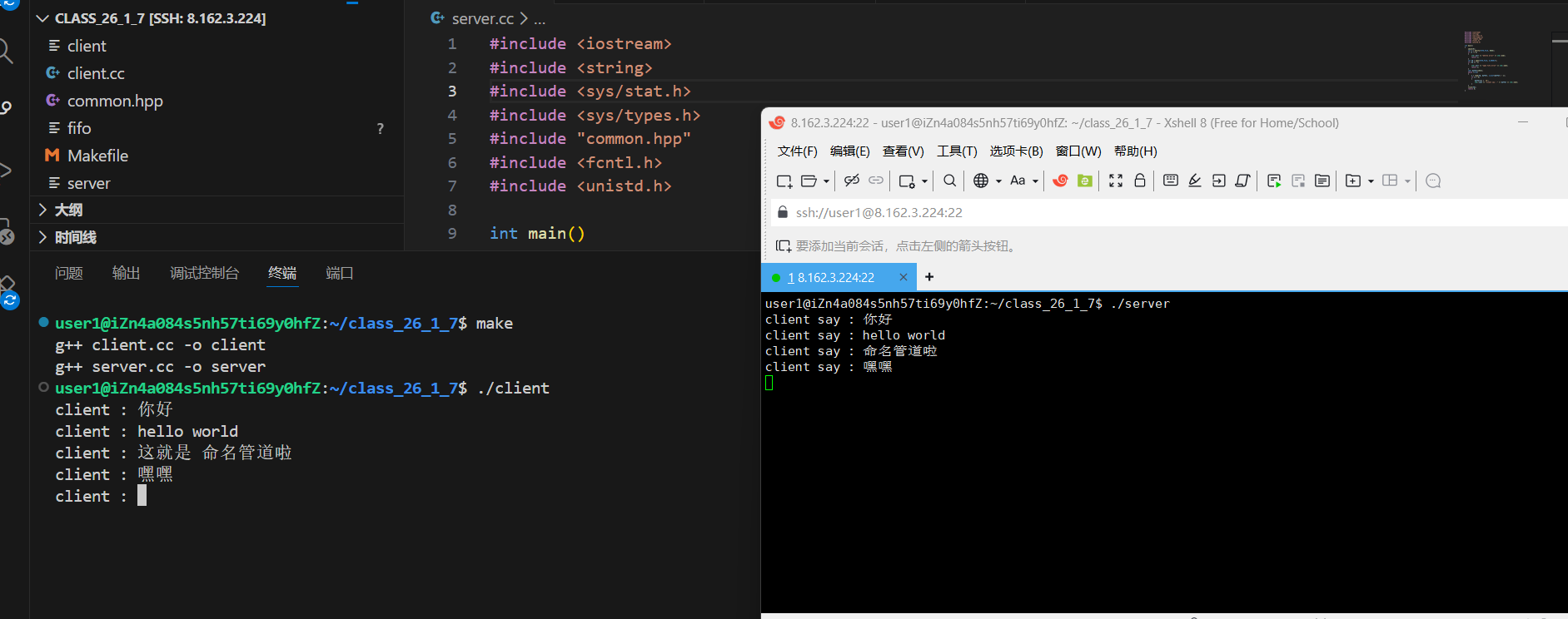 我们需要先使用./server来创建管道,不然直接使用./client会因为没有创建管道而报错哦