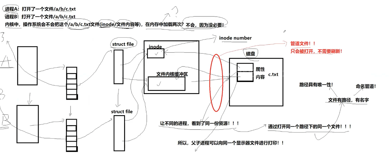 因为这也太浪费资源了,我们前面学过,假如A打开了一个.txt,那么就会创建出对应的struct_file,此时struct_file指向打开的文件,如果我们再用进程B打开这个文件,虽然B也会创建一个struct_file,但是也是指向打卡文件