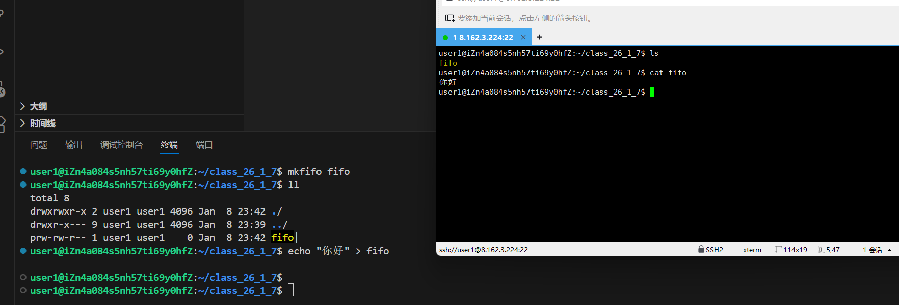 echo "你好" > fifo时,这是一个写操作,会尝试向 FIFO 写入数据 - 但此时没有任何进程打开这个