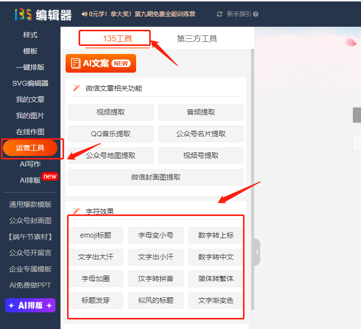 135编辑器的"字符效果"功能集成于左侧工具栏的"运营工具"模块,具体定位路径:编辑器编辑界面 → 左侧工具栏 → 找到"运营工具"分类 → 展开后选择"字符效果"选项,即可进入功能操作页面。