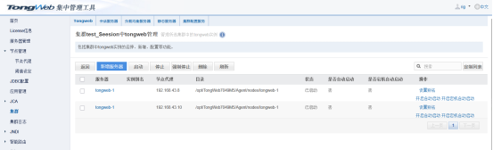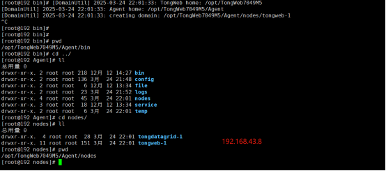 2、启动192.168.43.8的TongWeb7049M5,并登录集中管理台。分别启动两台服务器的Agent管理器(TongWeb7049M5/Agent/bin sh startbg.sh)。启动成功后集中管理台-节点管理-节点代理可以查看到带上的节点信息。
