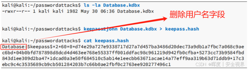 使用文本编辑器(如nano、vim)打开keepass.hash文件,删除开头的 Database: 字符串:
