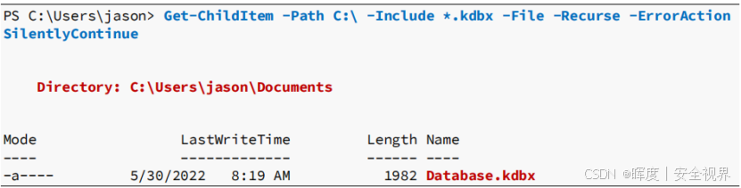 在了解后,我们开始搜索系统上的所有.kdbx文件来定位数据库文件。打开 PowerShell,执行以下关键命令: