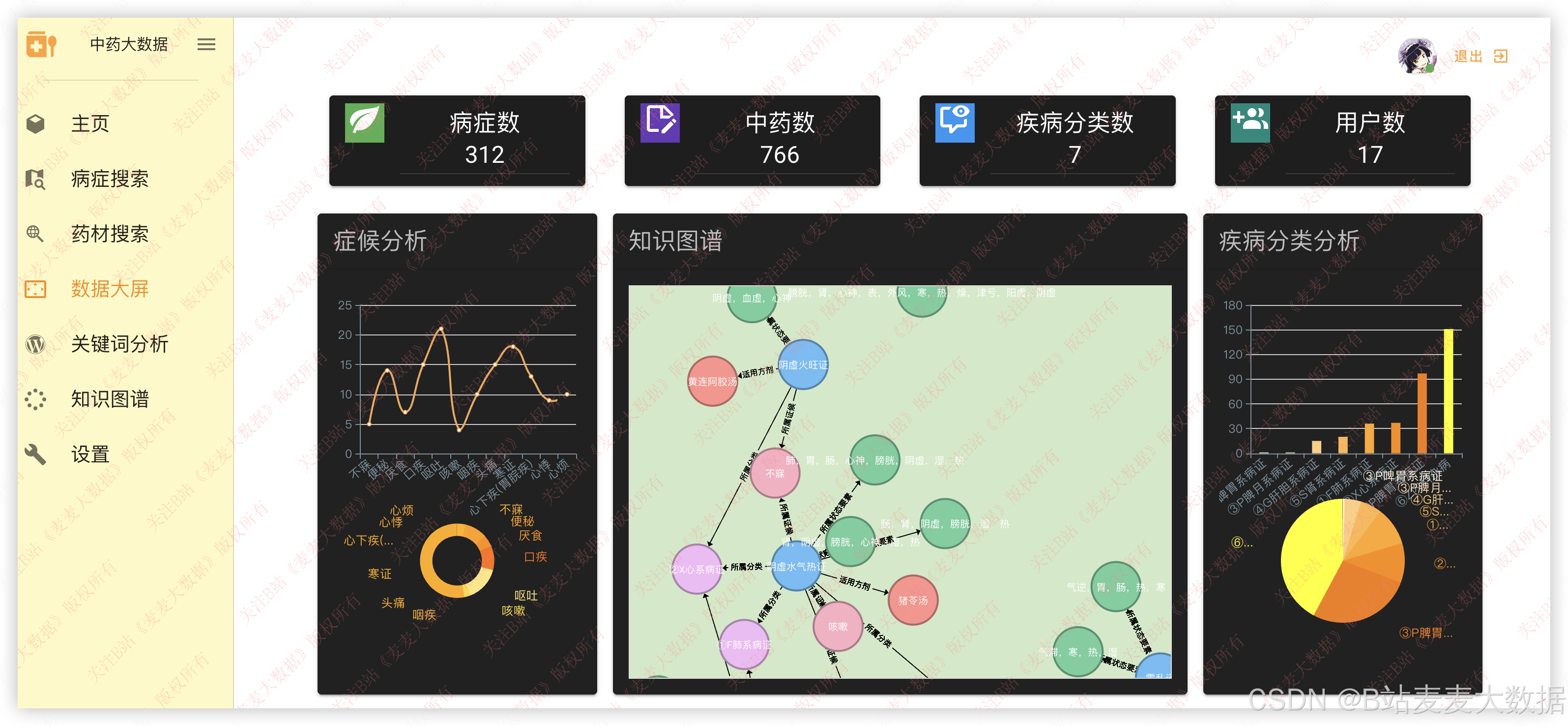 - 症候分析图:饼图、条形图展示常见症候分布。