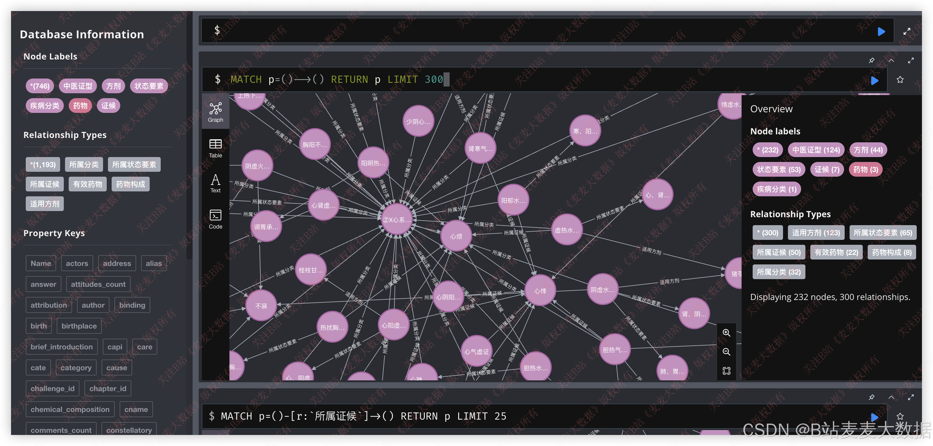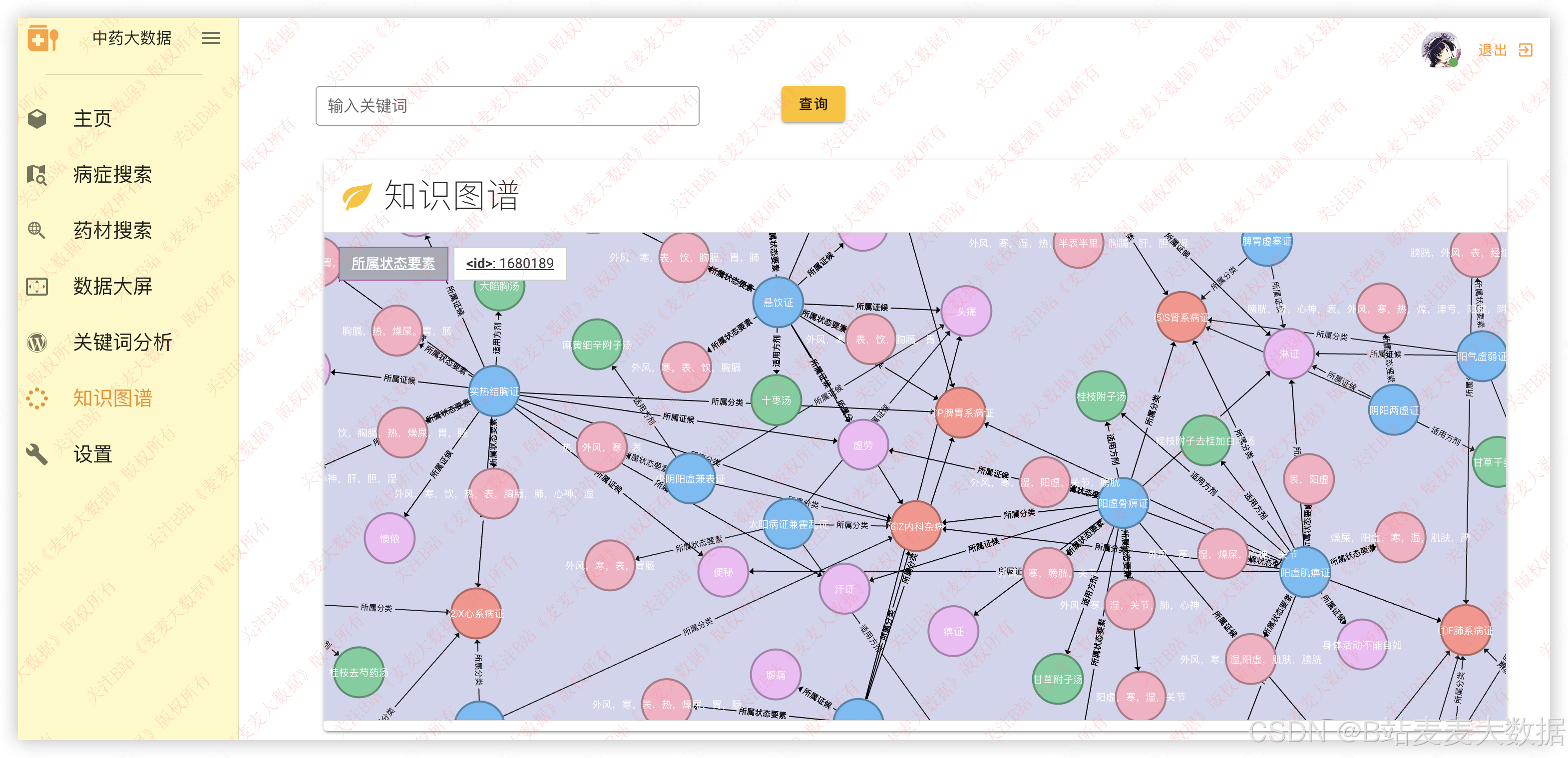 系统构建 中医病症-症候-方剂-药材-性味归经-功效 等多维知识图谱,采用 Neo4j 存储,通过 Py2neo 与后端交互。