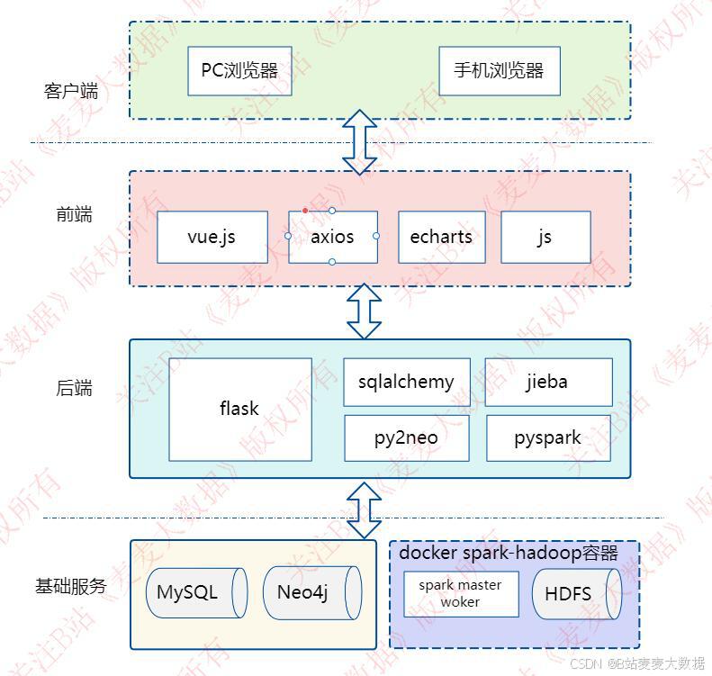 分析数据来源为 Neo4j+MySQL 联合查询,后端通过 Flask APIs 提供接口,前端动态请求展示。