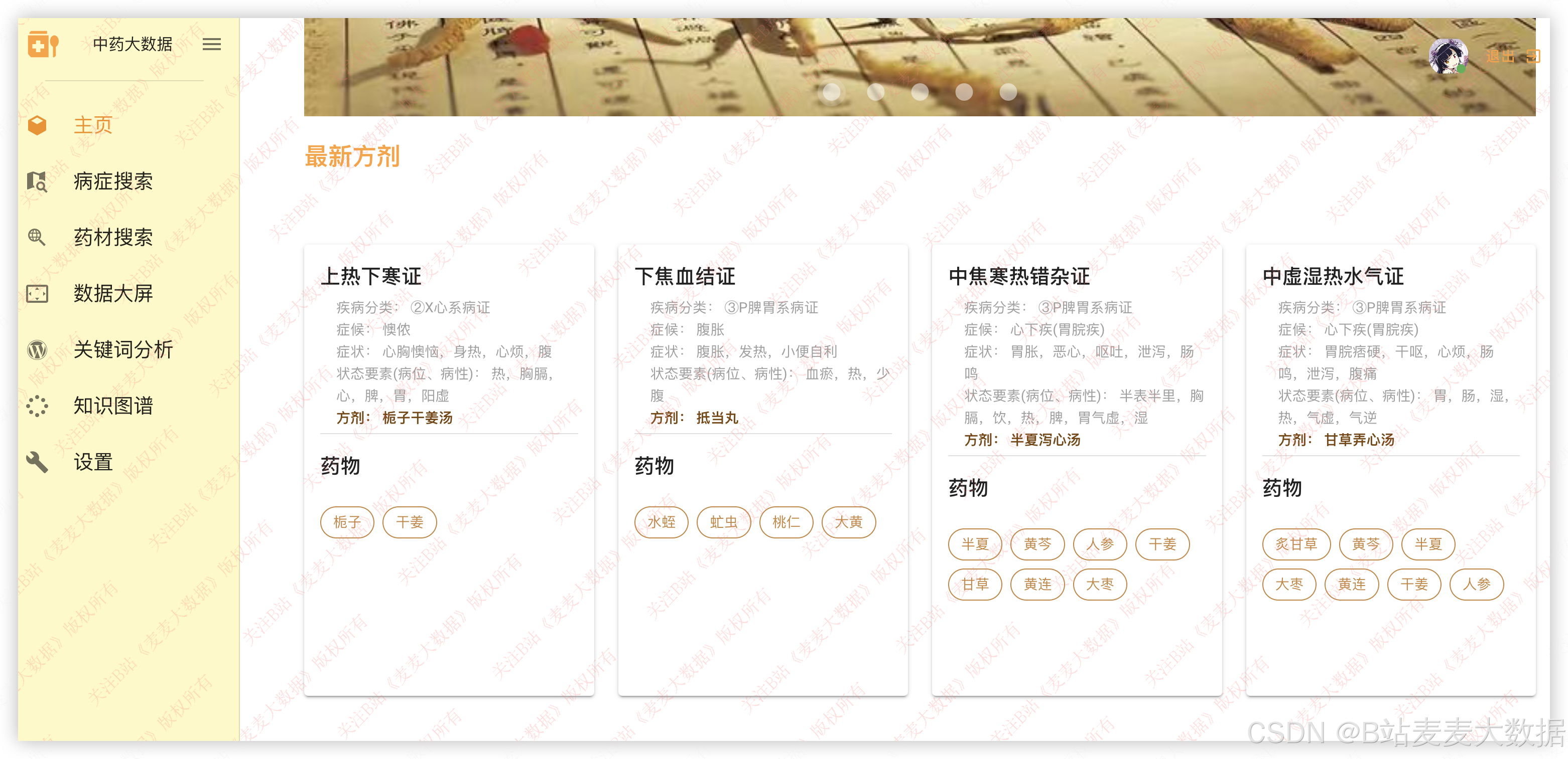 主页提供 中医古籍主题轮播图 展示系统亮点内容,下方使用卡片式布局展示最近上线的方剂 ,每个方剂卡包含名称、主治、组成药物等信息,点击可查看详情。