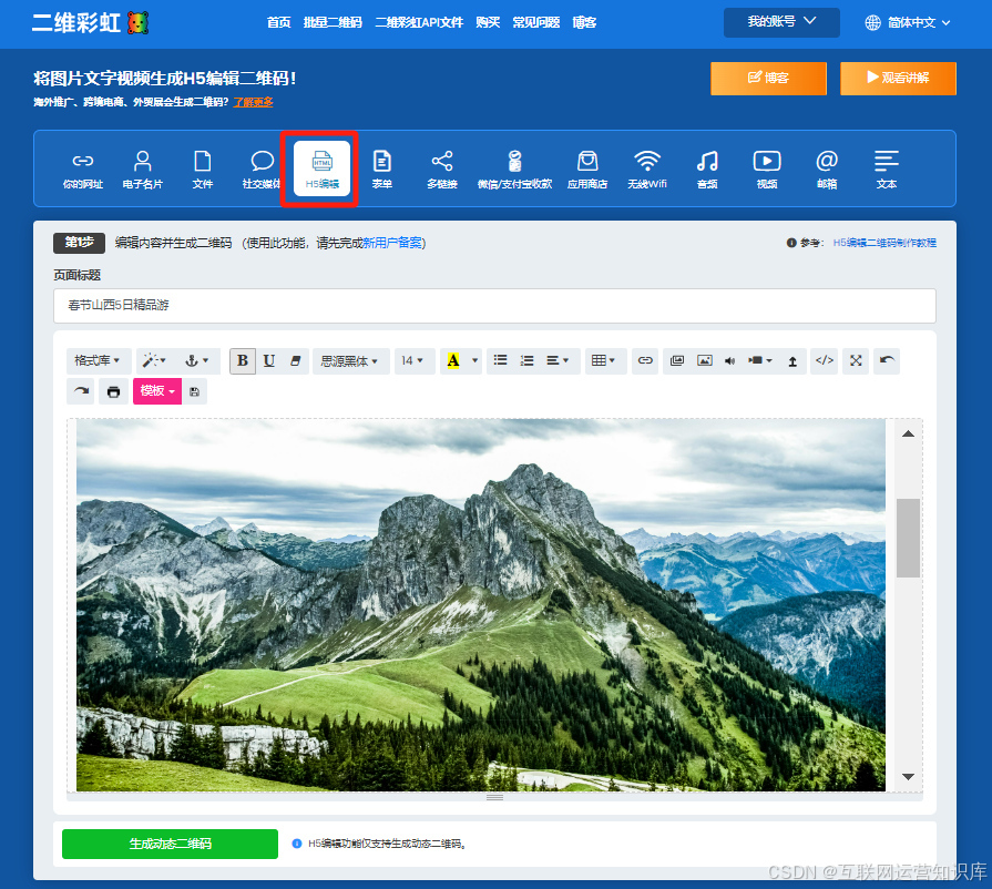 如果您没有自己的官网,可以通过【H5编辑】功能将这些旅游攻略内容生成一个二维码。下面我们就是以【H5编辑】功能来举例,下图仅供参考: