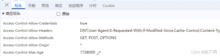 **Access-Control-Max-Age:**当浏览器发起一个带自定义请求头使用PUT/DELETE方法发送JSON数据等,会先自动发送以OPTIONS预检请求到服务'跨域请求是否被允许',避免相同请求重复发送预检请求,设置时间控制缓存持续时间。