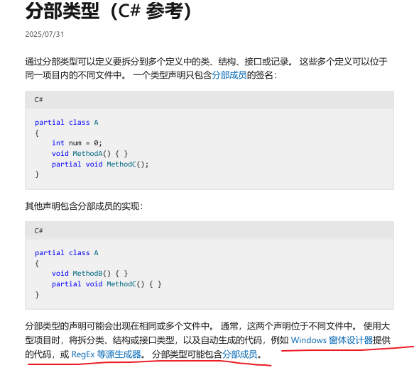首先分析partial(分部类型):通过分部类型可以定义要拆分到多个定义中的类、结构、接口或记录。 这些多个定义可以位于同一项目内的不同文件中。(定义我是从官方文档弄过来的)