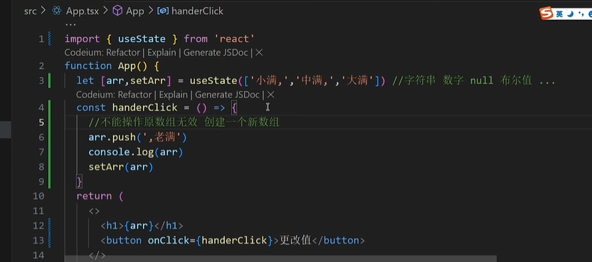 在 React 中你需要将数组视为只读的,不可以直接修改原数组,例如:不可以调用 arr.push() arr.pop() 等方法。
