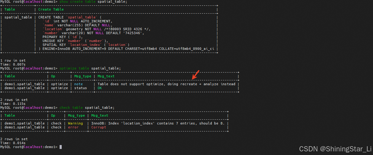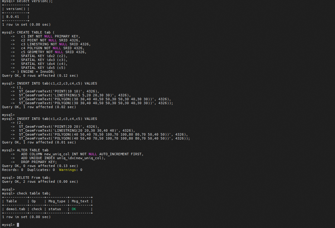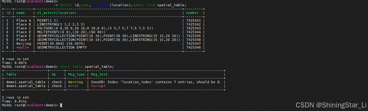 MySQL建Spatial 索引的前提条件是列定义NOT NULL ,而当location 列中有**'GEOMETRYCOLLECTION EMPTY '** 的值时,这里**'GEOMETRYCOLLECTION EMPTY'**变相绕过了这个限制,会导致报错。
