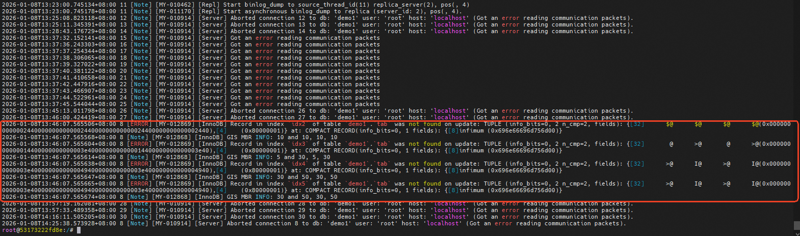 先对含SPATIAL KEY 的表做过 ALTER TABLE → R-tree 根页指针错乱,后续UPDATE/DELETE 走空间索引时找不到记录 → 报Record in index ... not found 。在MySQL Server 5.7.49 、8.0.41 、8.4.4 和9.2.0版本中修复。