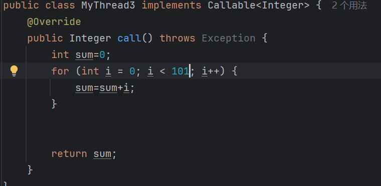 逻辑:创建一个类实现Callable接口并重写call(是有返回值的,表示多线程运行的结果),在测试类中,先创建这个类的对象(表示多线程要执行的任务),再创建Future实现类的对象(管理多线程运行的结果)(Future本身是一个接口),在创建Thread对象