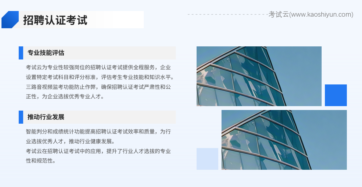 某行业协会采用考试云进行招聘认证考试,通过在线考试的形式对考生的专业技能和知识水平进行全面评估。考试云的人脸防替考技术和三路音视频监考功能有效防止了作弊行为的发生,确保了招聘认证考试的严肃性和公正性。同时,智能判分和成绩统计功能也大大提高了招聘认证考试的效率和质量,为行业选拔出了优秀人才,推动了行业的健康发展。