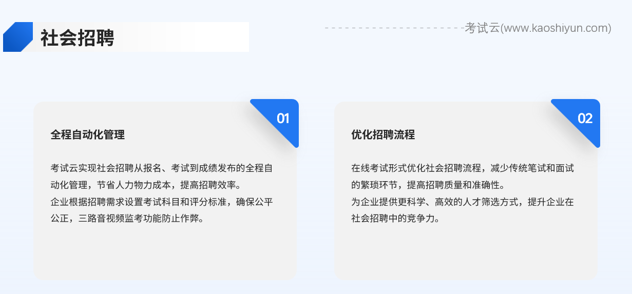 社会招聘是企业获取人才的重要渠道之一。然而,传统的笔试和面试流程往往耗时费力,且难以确保公平性和准确性。考试云通过在线考试的形式,实现了从报名、考试到成绩发布的全程自动化管理。企业可以根据招聘需求设置特定的考试科目和评分标准,确保每一位求职者都能在公平、公正的环境下展示自己的才华。同时,考试云的三路音视频监考功能也能有效防止作弊行为的发生,保障招聘考试的严肃性和公正性。