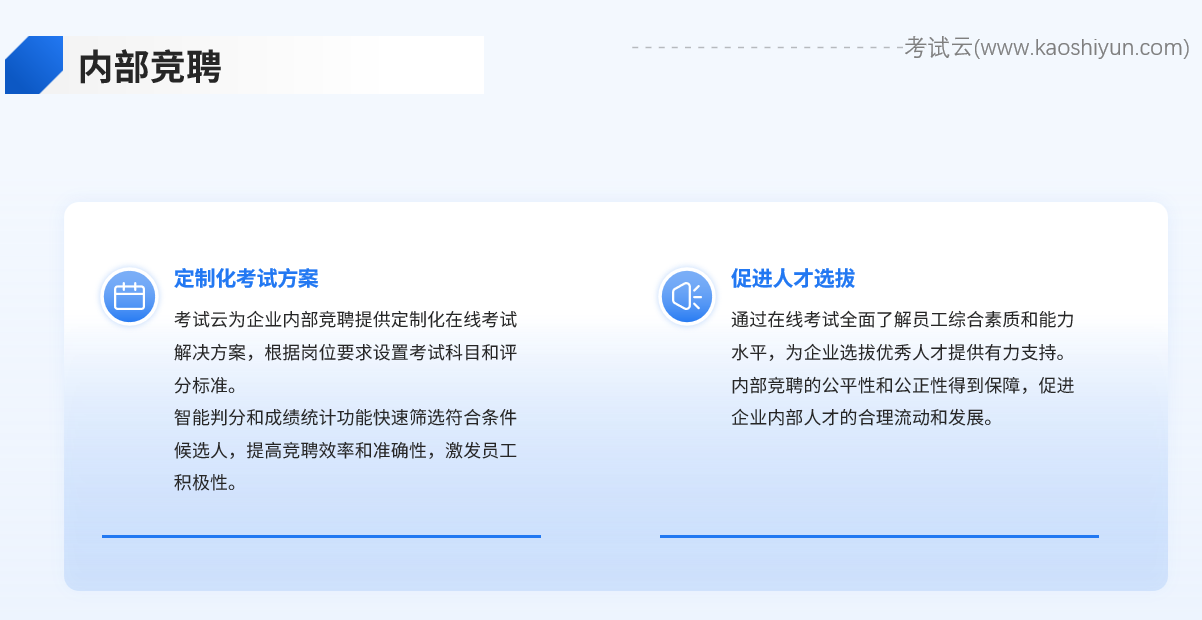 内部竞聘是企业选拔优秀人才、激发员工活力的有效途径。考试云可以为企业提供定制化的在线考试解决方案,根据竞聘岗位的要求设置特定的考试科目和评分标准。通过在线考试的形式,企业可以全面了解员工的综合素质和能力水平,为竞聘决策提供有力支持。同时,考试云的智能判分和成绩统计功能也能帮助企业快速筛选出符合条件的候选人,提高竞聘效率和准确性。
