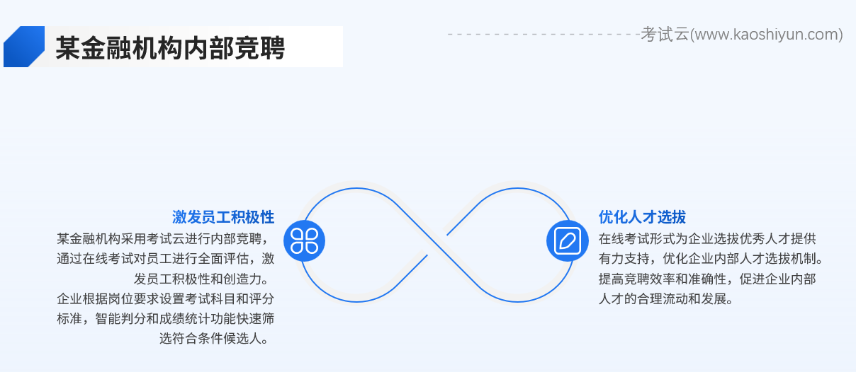 某金融机构采用考试云进行内部竞聘,通过在线考试的形式对员工进行全面评估。企业根据竞聘岗位的要求设置了特定的考试科目和评分标准,通过考试云的智能判分和成绩统计功能快速筛选出了符合条件的候选人。这一举措不仅激发了员工的积极性和创造力,也为企业选拔出了优秀人才,为企业的持续发展提供了有力保障。