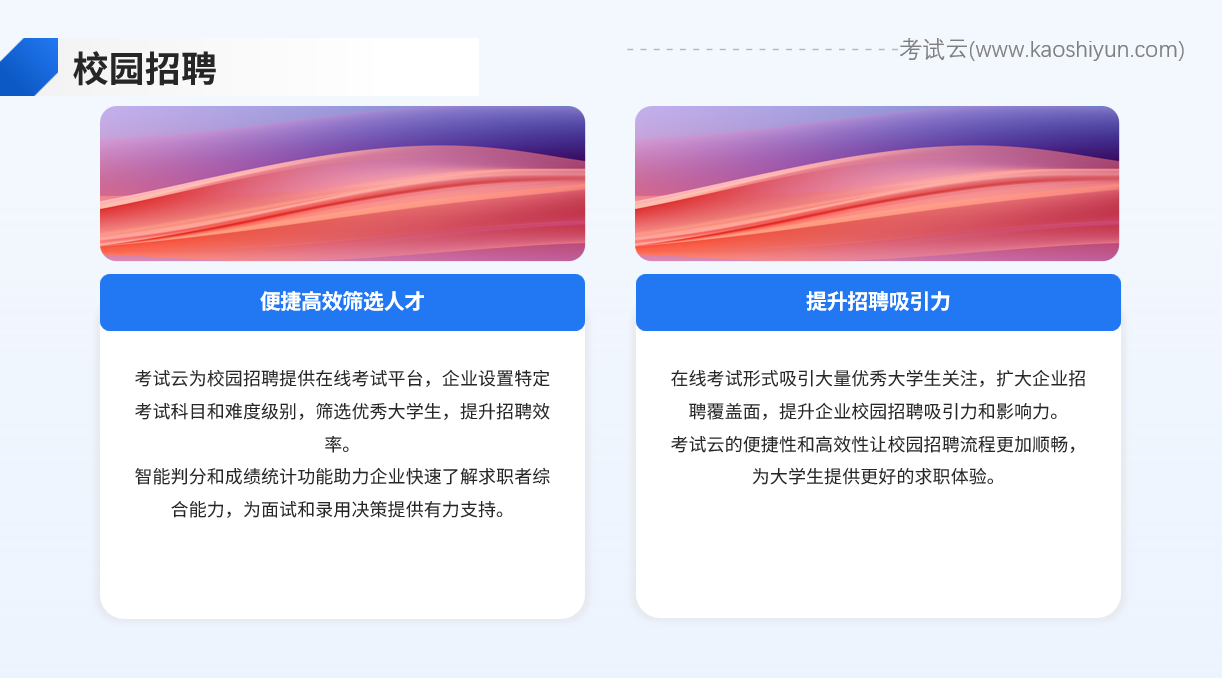 对于即将步入社会的大学生而言,校园招聘是他们获取就业机会的重要途径。考试云可以通过在线考试的形式,为企业和求职者提供一个便捷、高效的交流平台。企业可以通过设置特定的考试科目和难度级别,筛选出符合要求的优秀人才。同时,考试云的智能判分和成绩统计功能也能帮助企业快速了解求职者的综合能力水平,为后续的面试和录用决策提供有力支持。