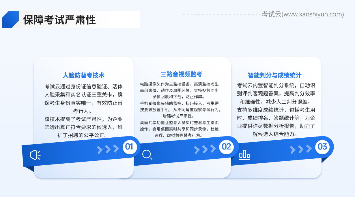 在招聘严肃性考试中,防作弊是确保考试公正性的关键。考试云的三路音视频监考功能,通过电脑摄像头、手机副摄像头和桌面共享三路音视频监控,构建了全方位、无死角的监控体系。