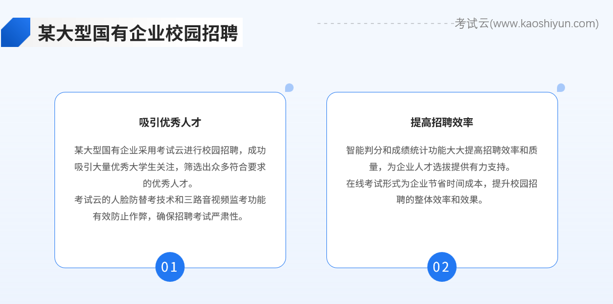 某大型国有企业近年来一直采用考试云进行校园招聘。通过在线考试的形式,企业成功吸引了大量优秀大学生的关注,并筛选出了众多符合要求的优秀人才。考试云的人脸防替考技术和三路音视频监考功能有效防止了作弊行为的发生,确保了招聘考试的严肃性和公正性。同时,智能判分和成绩统计功能也大大提高了招聘效率和质量,为企业的人才选拔提供了有力支持。