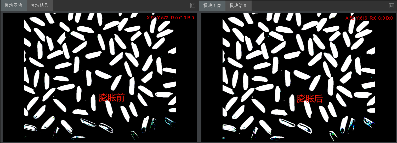膨胀前后对比可知,膨胀后,白色区域相对变大。