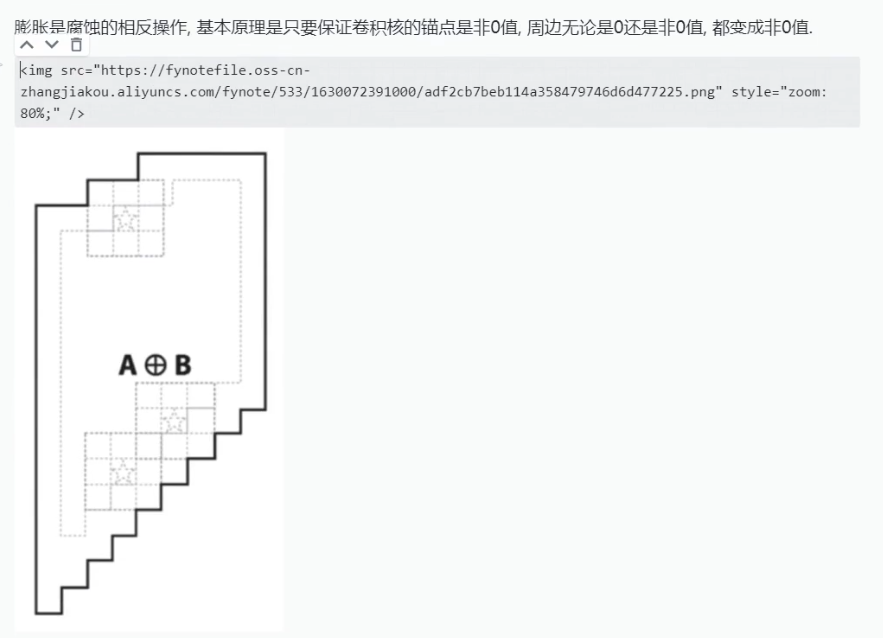 膨胀原理与章6腐蚀基本相同,不同处在于膨胀是以卷积核锚点的值来决定卷积结果,即锚点非0时,无论周边是0还是非0,都变成非0值。